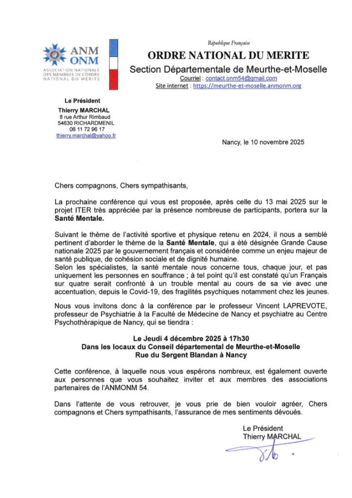 La Section Départementale de Meurthe-et-Moselle de l’Ordre National du Mérite organise une conférence exceptionnelle consacrée à la Santé Mentale, désignée Grande Cause nationale 2025 par le gouvernement français.